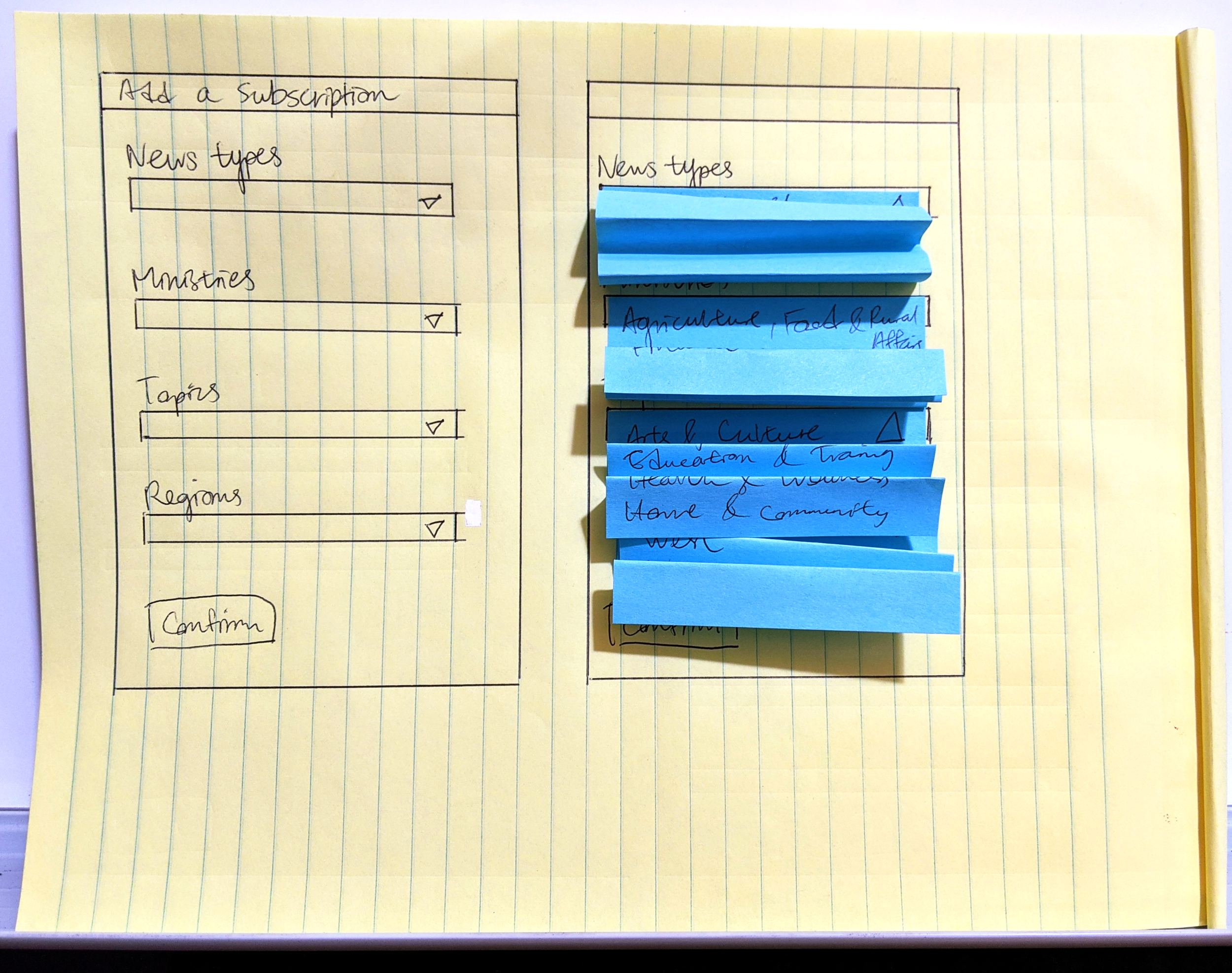 I conceptualized two functionalities that required rapid testing. First, users should have the ability to subscribe to news across multiple parameters (ministries, news types and topics). Second, users should also be able to stack multiple sets of highly customized subscriptions. Two sets of low-fidelity mockups were prepared for users to test.